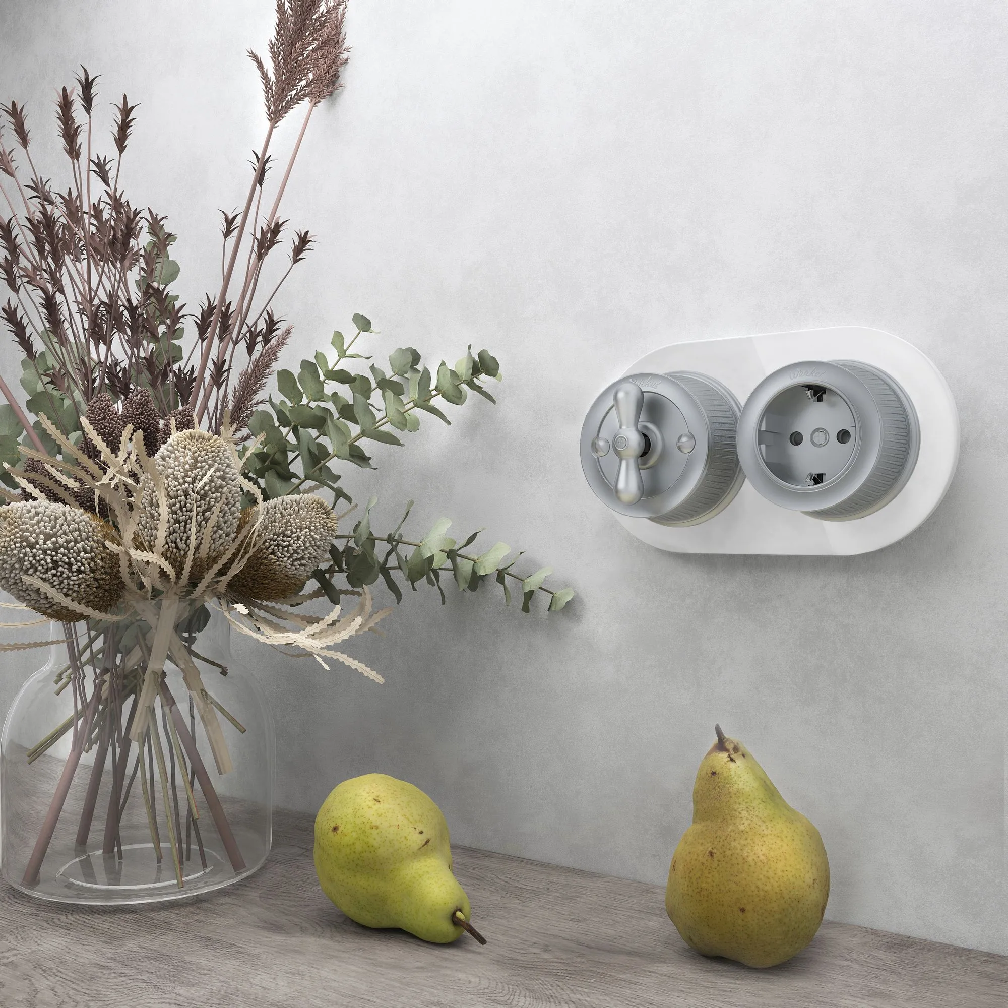 Гладкая стеклянная поверхность рамки отражает свет, создавая эффект глубины и объема, что делает ее идеальным фоном для декоративных элементов, таких как ретро переключатели и розетки. Рамка легко монтируется и совместима с различными моделями электроустановочных изделий из коллекций Werkel.