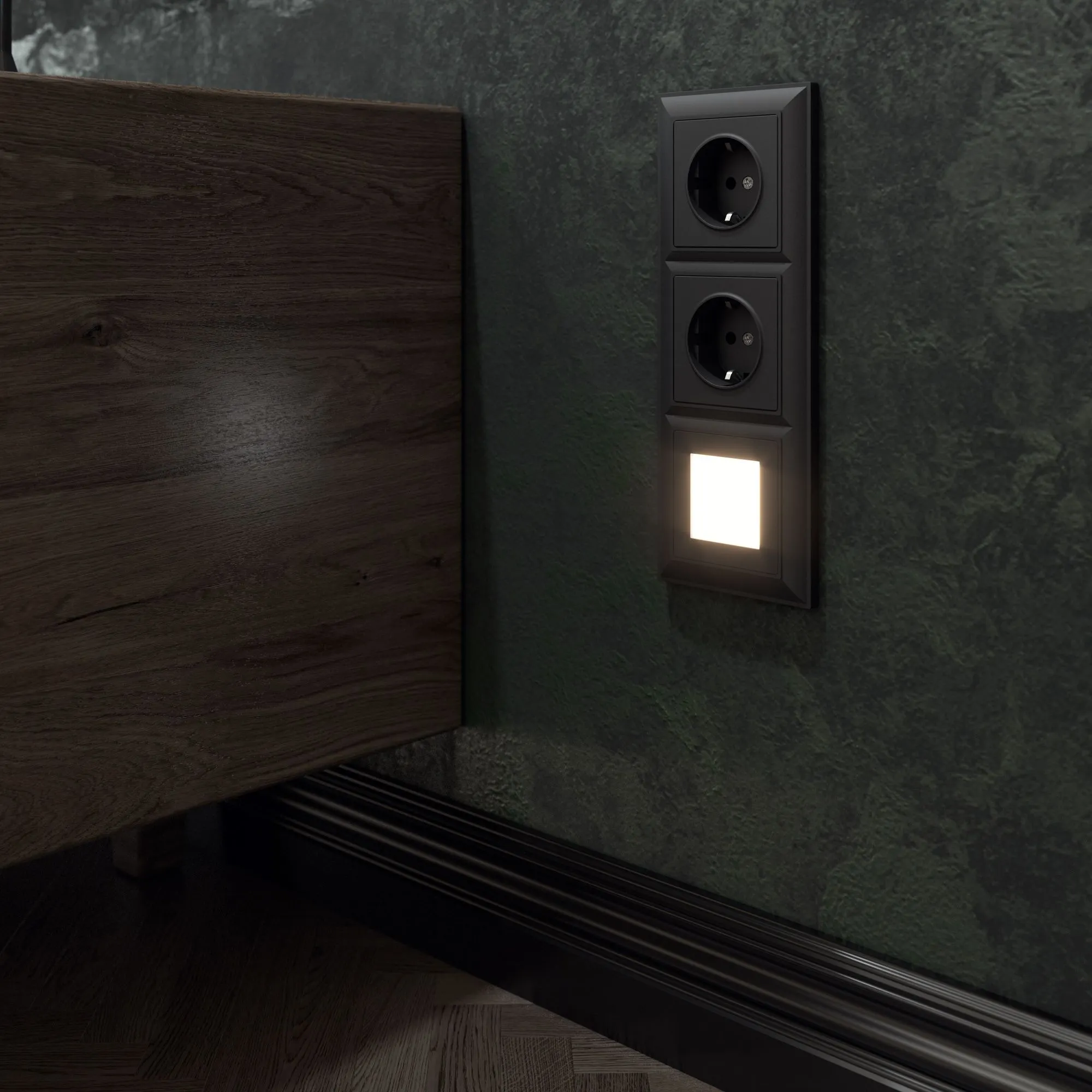 Лицевая панель выполнена в матовом черном цвете с бархатистой фактурой и тактильной мягкостью. Такая поверхность не бликует, не притягивает пыль и идеально вписывается в любые стили — от скандинавского минимализма до лофта и классики. Черный цвет гармонично сочетается с любыми отделочными материалами, а универсальная совместимость со всеми рамками Werkel позволяет создавать индивидуальные композиции под ваш вкус.