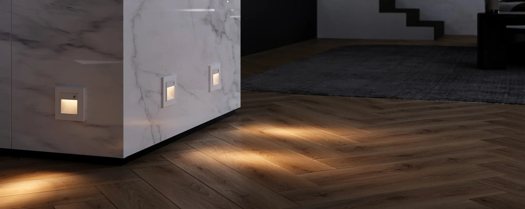 Подсветка применяется для освещения ступеней лестниц, коридоров, прикроватной и рабочей зоны на кухне. Она позволяет безопасно передвигаться и ориентироваться в помещении без включения основного света.