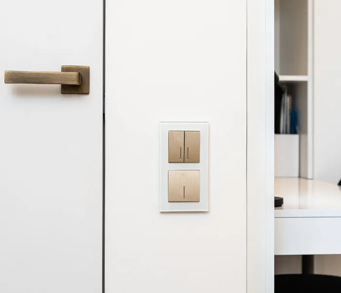 Стильным акцентом интерьера стали рамки серии Favorit в белом и дымчатом цветах. Они выполнены из закалённого стекла толщиной 4 мм с идеально отшлифованной фаской, что гарантирует безопасность и долговечность . Механизмы в цвете «шампань рифлёный» гармонично вписались в современный дизайн, подчеркнув эстетику проекта.
